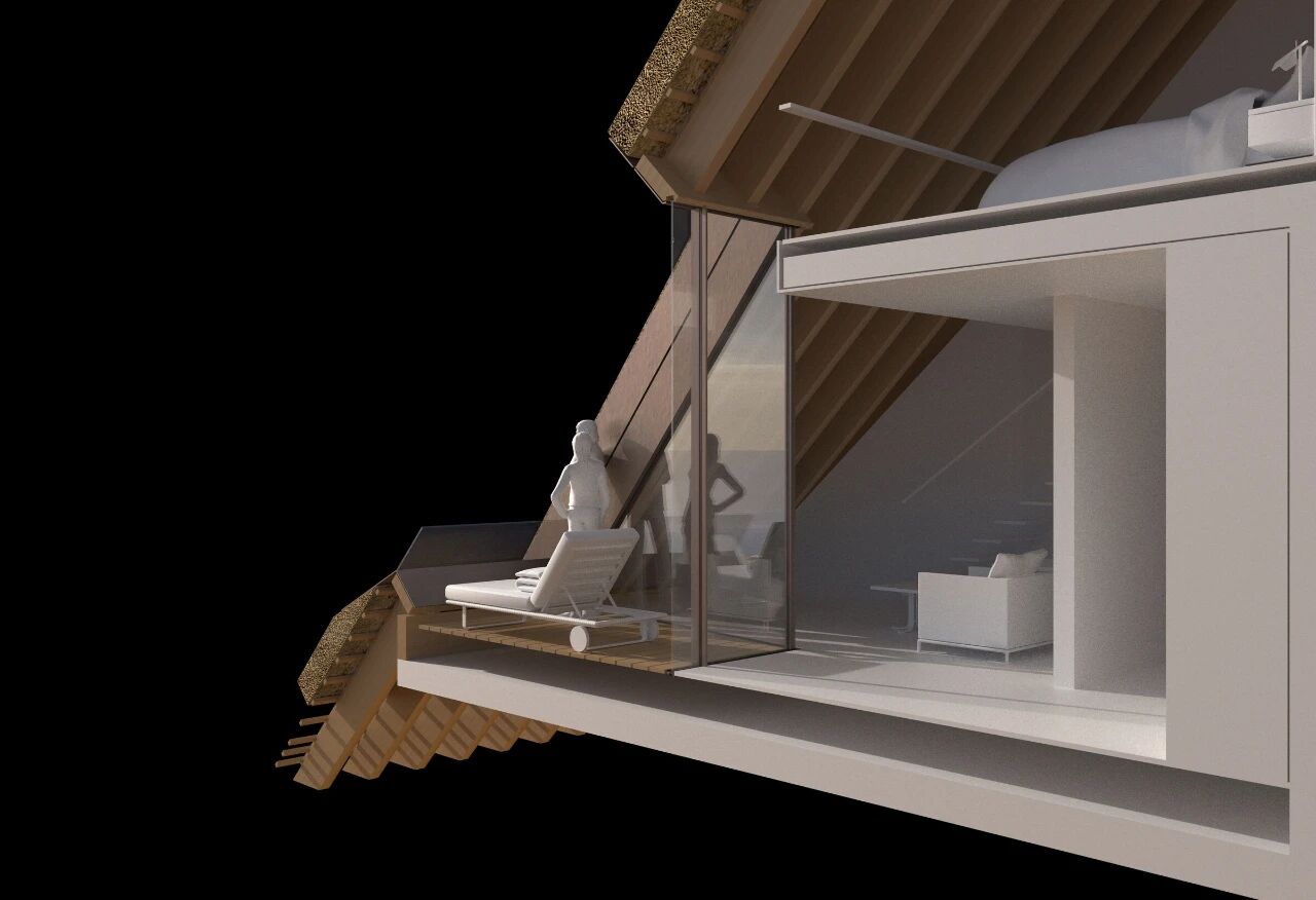 32间客房中,每间都配有带遮挡的室外区域,凉棚设置在屋檐之下,让住客在沙丘与森林的怀抱中静思。