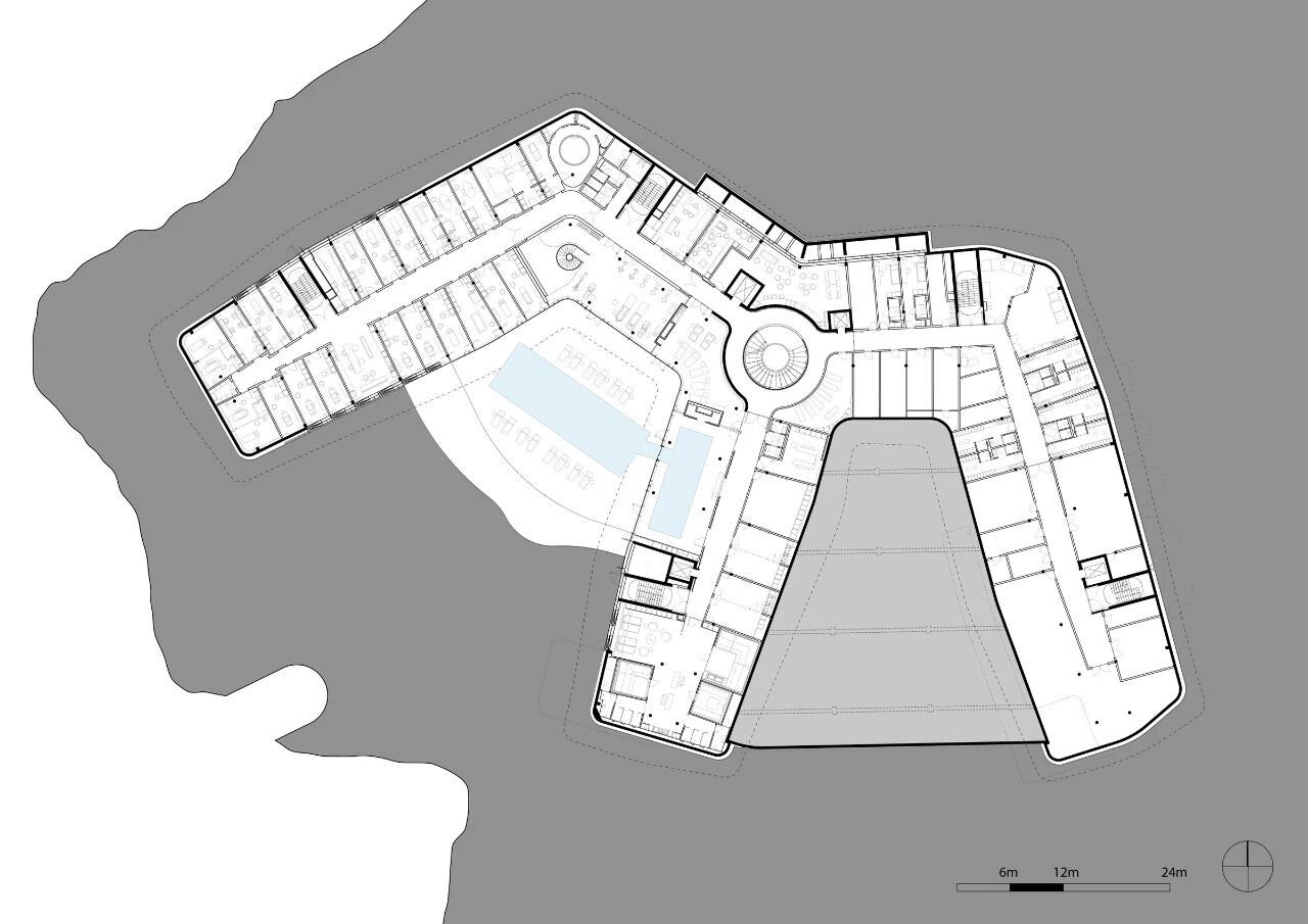 内墙与外墙采用平整或有纹理的天然饰面,餐饮区与水疗区地面水磨石由当地砾石与石材混合替代,实现材料的地域性与可持续性。
