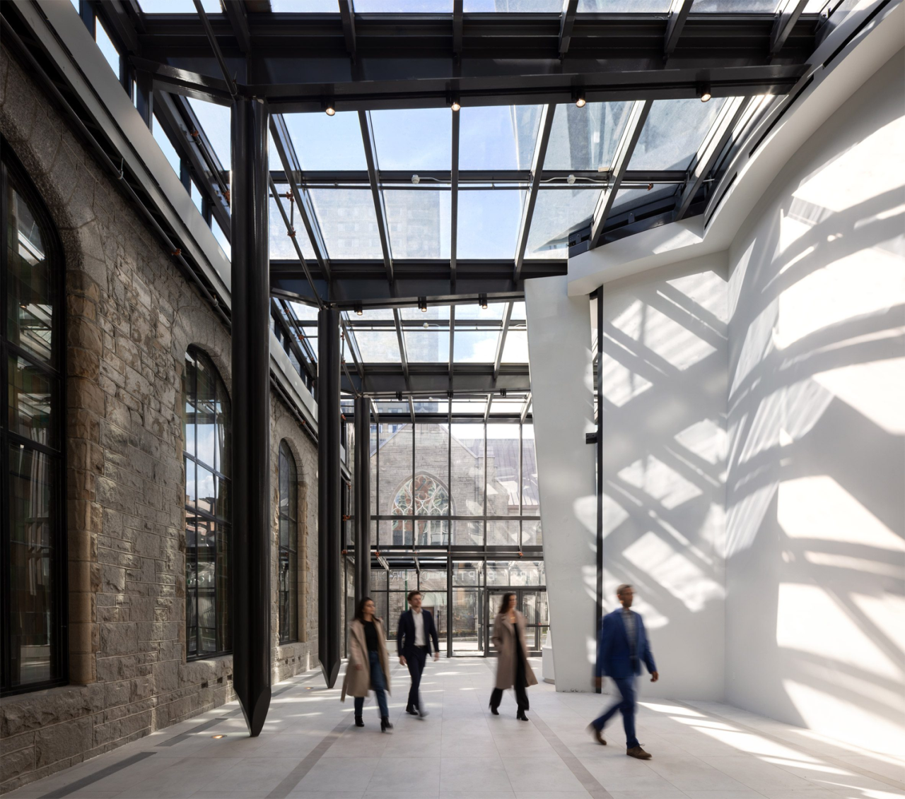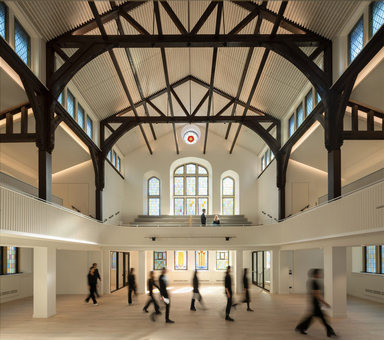 底层通过玻璃连廊连接教堂与公共设施,开放音乐厅、托儿所等公共区域,打破商住楼的封闭性,激活社区活力。